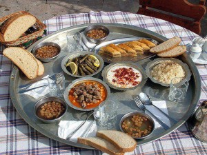 İlçemizin yemek âdetleri yani öğünlere göre tüketilen yemek çeşitleri genellikle aynıdır. Bütün evlerde her akşam tarhana çorbası yenilir. Bu çorbanın ana maddesi halkın kendisi tarafından hazırlanmakta ve uzun bir süre tüketilmektedir. Bunun yanı sıra tavuk, kaz ve hindi eti de çok meşhurdur. Genellikle civciv olarak aldıkları tavuk, kaz ve hindileri yetiştirirler. Ramazan ayında sahur vakti gözleme yapılır ve yanında komposto ile yenir. İftar yemekleri ise genellikle çorba, et ve pilavdır.