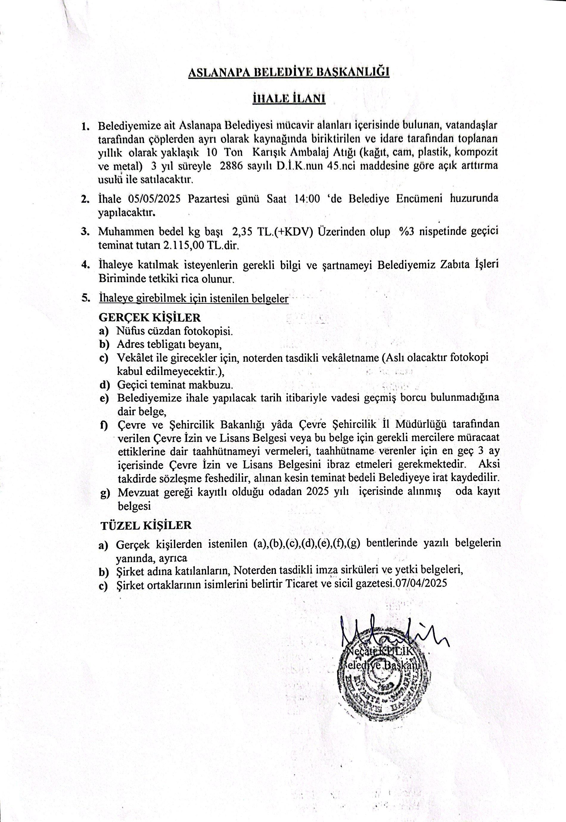 Belediyemize ait Aslanapa Belediyesi mücavir alanları içerisinde bulunan , vatandaşlar tarafından çöplerden ayrı olarak kaynağında biriktirilen ve idare tarafından toplanan yıllık olarak yaklaşık 10 Ton Karışık Ambalaj Atığı (kağıt, cam, plastik, kompozit ve metal) 3 yıl süreyle 2886 sayılı D.İ.K.nun 45.nci maddesine göre açık arttırma usulü ile satılacaktır.
